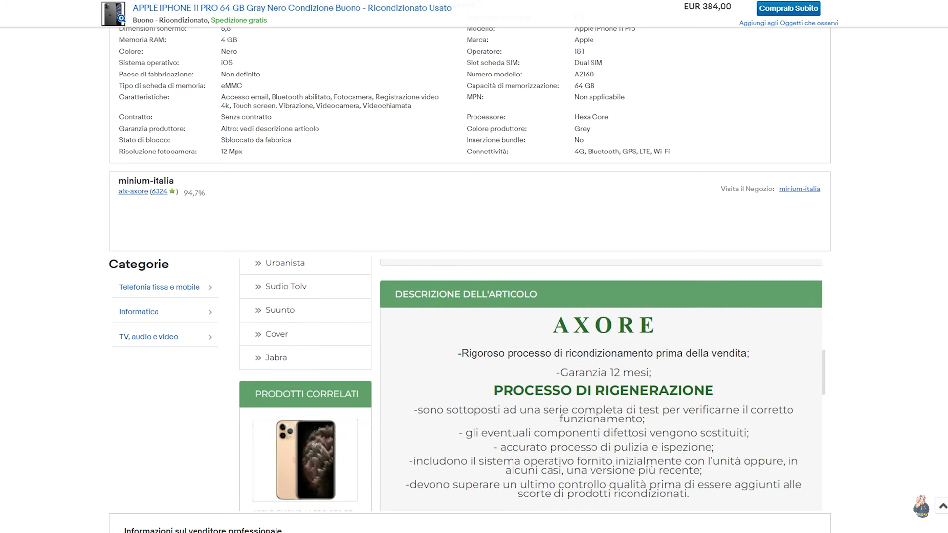 In questo caso infatti vedrai riportate le specifiche dell’oggetto, che saranno le classiche di un iPhone 11 PRO mentre nella descrizione vera e propria. Nella parte sottostante, quindi, avrai la possibilità di navigare nello store, ed in questo caso, potrai spulciare tra le varie categorie e oggetti disponibili.