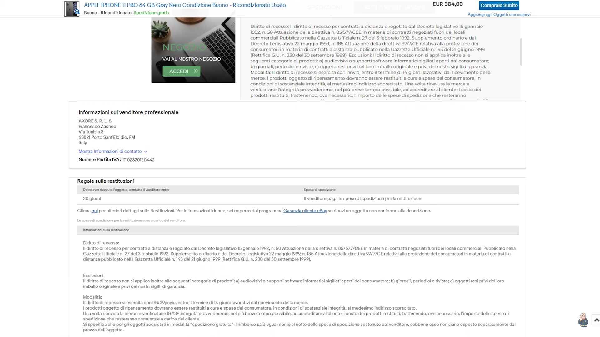 Molto importante sarà anche la parte di regole sulla restituzione che ti verrà spiegata in breve. In questo caso specifica che avrai a disposizione 30 giorni di recesso e che le spese di reso saranno pagate direttamente dal venditore.
